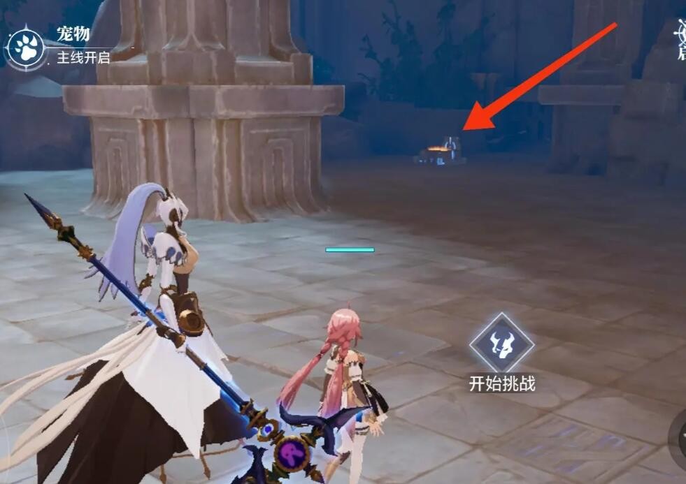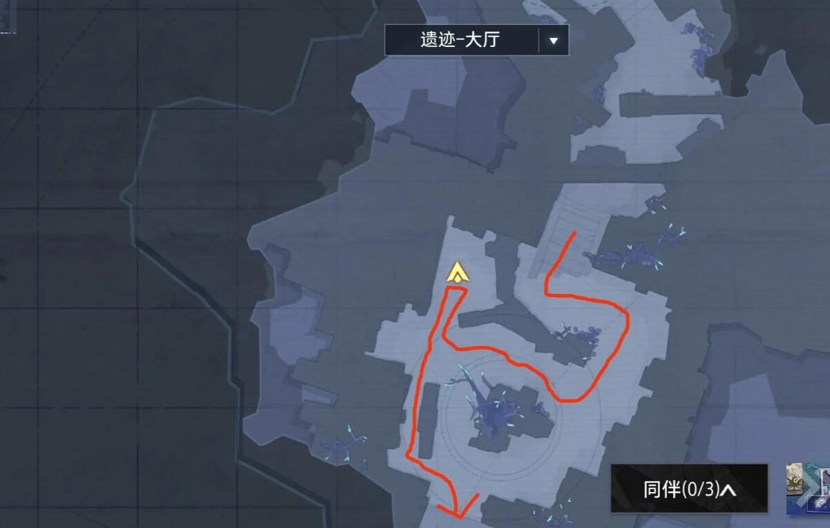 1、主线1-6密道,地图中间,玩家来到遗迹-大厅沿着红线走来到地图的中间就能看到宝箱
