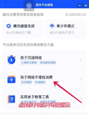 3、在网络管控家长必知会界面找我们找到孩子网络不理性消费选项,然后选择孩子不理性消费的情况。