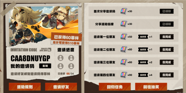 绳匠通过邀请回归绳匠成功绑定邀请码、完成回归任务,总计可获得菲林×510、抽奖机会×20。回归绳匠在此基础上,成功绑定邀请码可额外获得60菲林,总计获得菲林×570。
