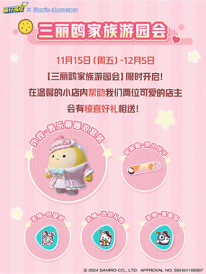 11月15日(周五)-12月5日,【三丽鸥家族游园会】限时开启!在温馨的小店内帮助我们两位可爱的店主会有惊喜好礼相送!