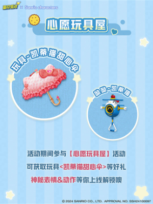 可爱的粉色兔耳释放信号,天蓝色的蝴蝶结更显少女心,充满甜美笑容的<美乐蒂>玩偶也加入甜蜜梦境,或许蛋仔们会在梦中尝到同款可口可丽饼!