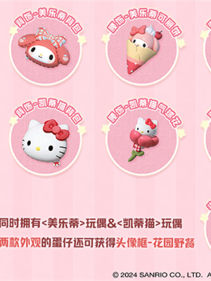 同时拥有<美乐蒂>玩偶&<凯蒂猫>玩偶两款外观的蛋仔还可获得【头像框-花园野餐】。
