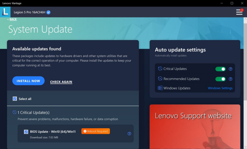 “我想好好呵护我的新 Legion 7,所以我始终保持最新的系统版本。像往常一样,我通过 Lenovo Vantage 检查了更新后看到一个“关键的 BIOS 更新”——GKCN53WW。我不太懂技术,所以我 (愚蠢地) 认为更新只会有好处。但最后证明确实是我错了。”另一位用户抱怨称。