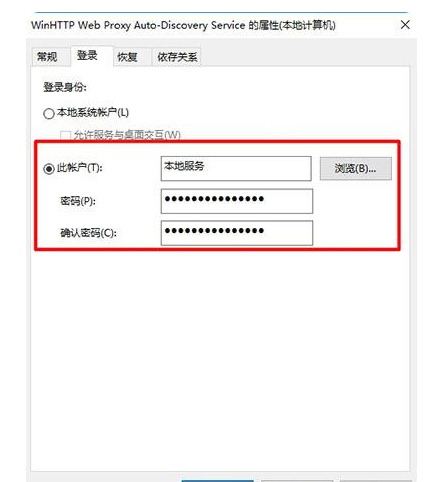 4、点击“登录”选卡,选择“此帐号”-本地服务,将下方两个密码框中的密码全部删除,点击确定;如图所示:
