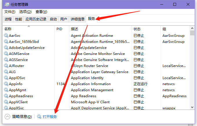 2、在任务管理器中选择【服务】选项卡,查看所有服务,点击【打开服务】进入服务查看全部服务。